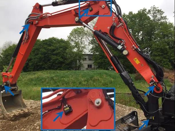 通過(guò)在智能挖掘機(jī)臂架上安裝動(dòng)態(tài)傾角儀,能夠利用其智能算法,對(duì)挖掘機(jī)的鏟斗、小臂、大臂和車體的姿態(tài)角度進(jìn)行測(cè)量,并實(shí)時(shí)準(zhǔn)確地進(jìn)行角度反饋。同時(shí),通過(guò)加速度傳感器和陀螺儀的信號(hào)相結(jié)合可以進(jìn)行運(yùn)動(dòng)補(bǔ)償,從而消除設(shè)備快速往復(fù)的運(yùn)動(dòng)、震動(dòng)及沖擊加速度帶來(lái)的影響,實(shí)現(xiàn)對(duì)智能挖掘機(jī)的姿態(tài)控制,隨時(shí)掌握挖掘機(jī)現(xiàn)場(chǎng)駕駛室的姿態(tài)和吊桿傾角變化情況。