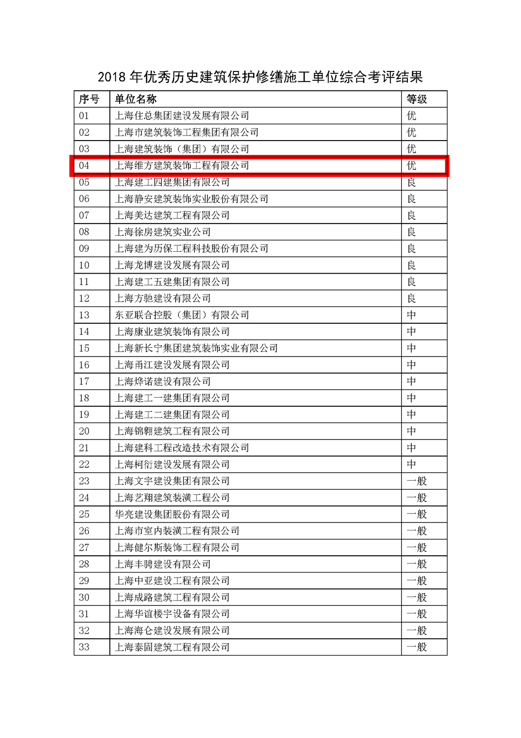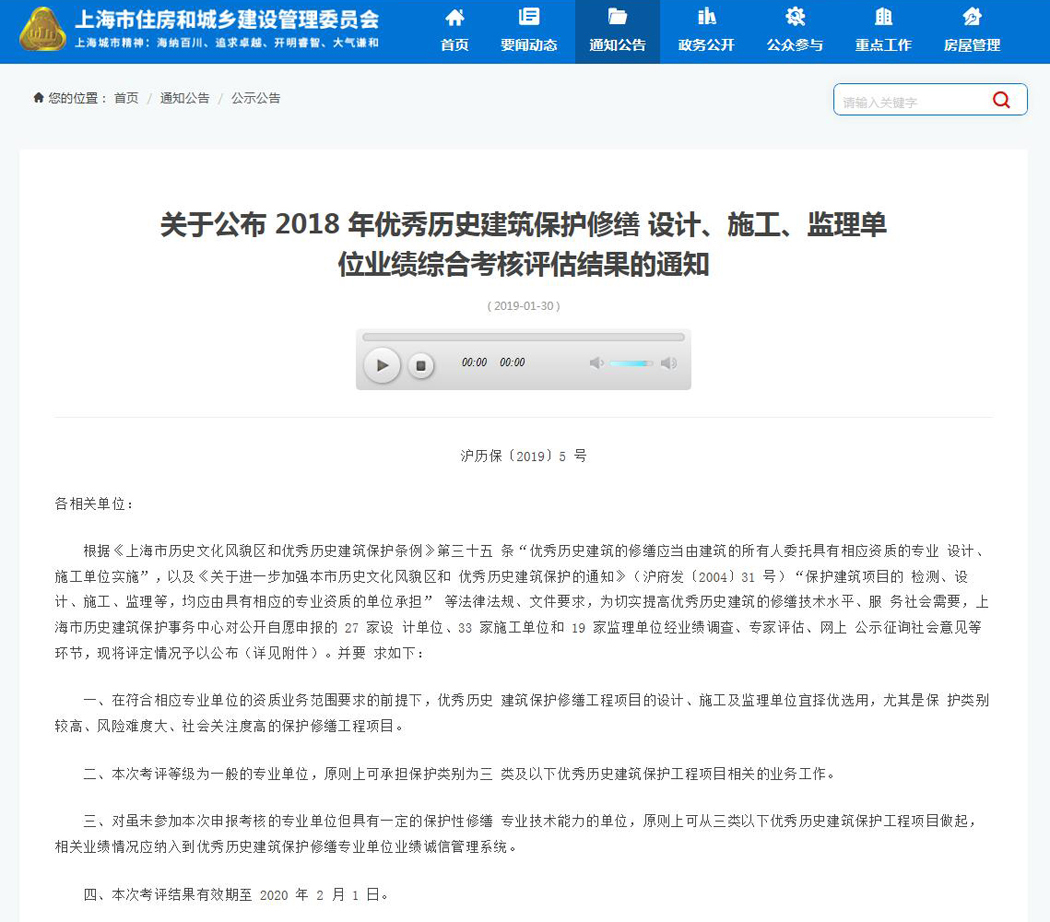 上海維方公司榮獲“2018年優秀歷史建筑保護修繕施工考評”優級單位